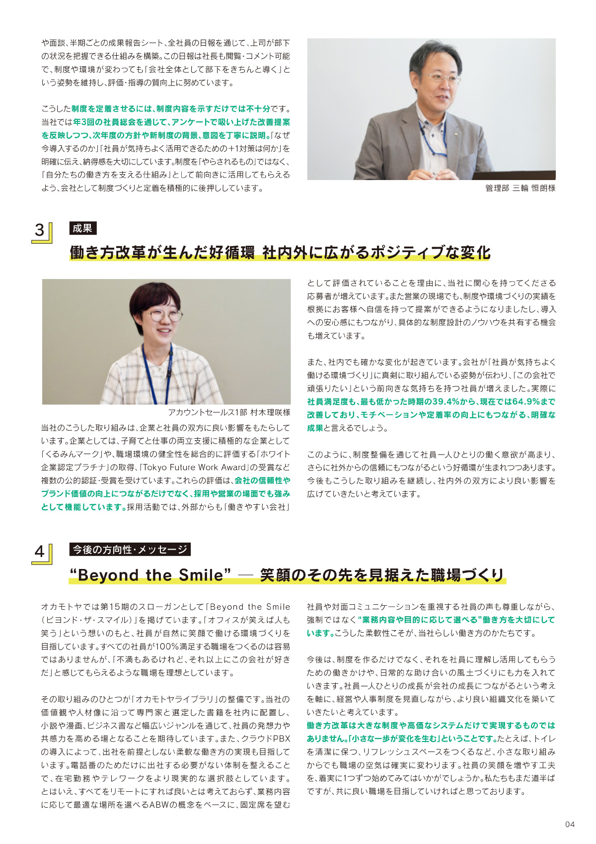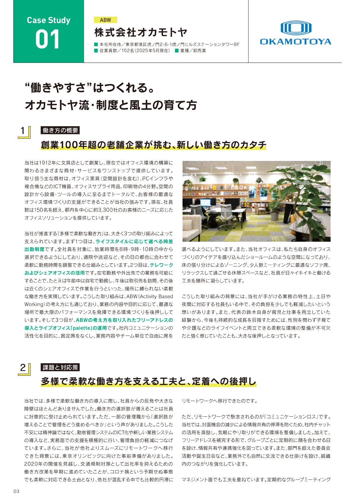 株式会社オカモトヤ 創業100年超の老舗企業が挑む、新しい働き方のカタチ。制度と風土づくりで柔軟な働き方を推進し、社員のモチベーションや定着率・企業価値の向上を実現。 ⤢ ✕ PDFをダウンロード (413KB)