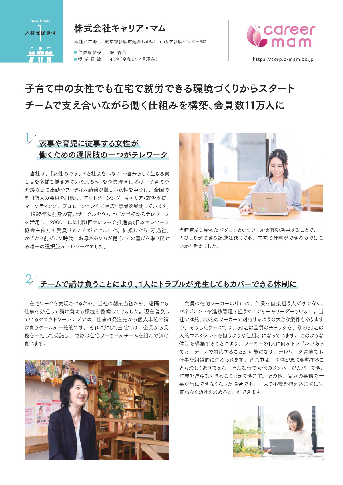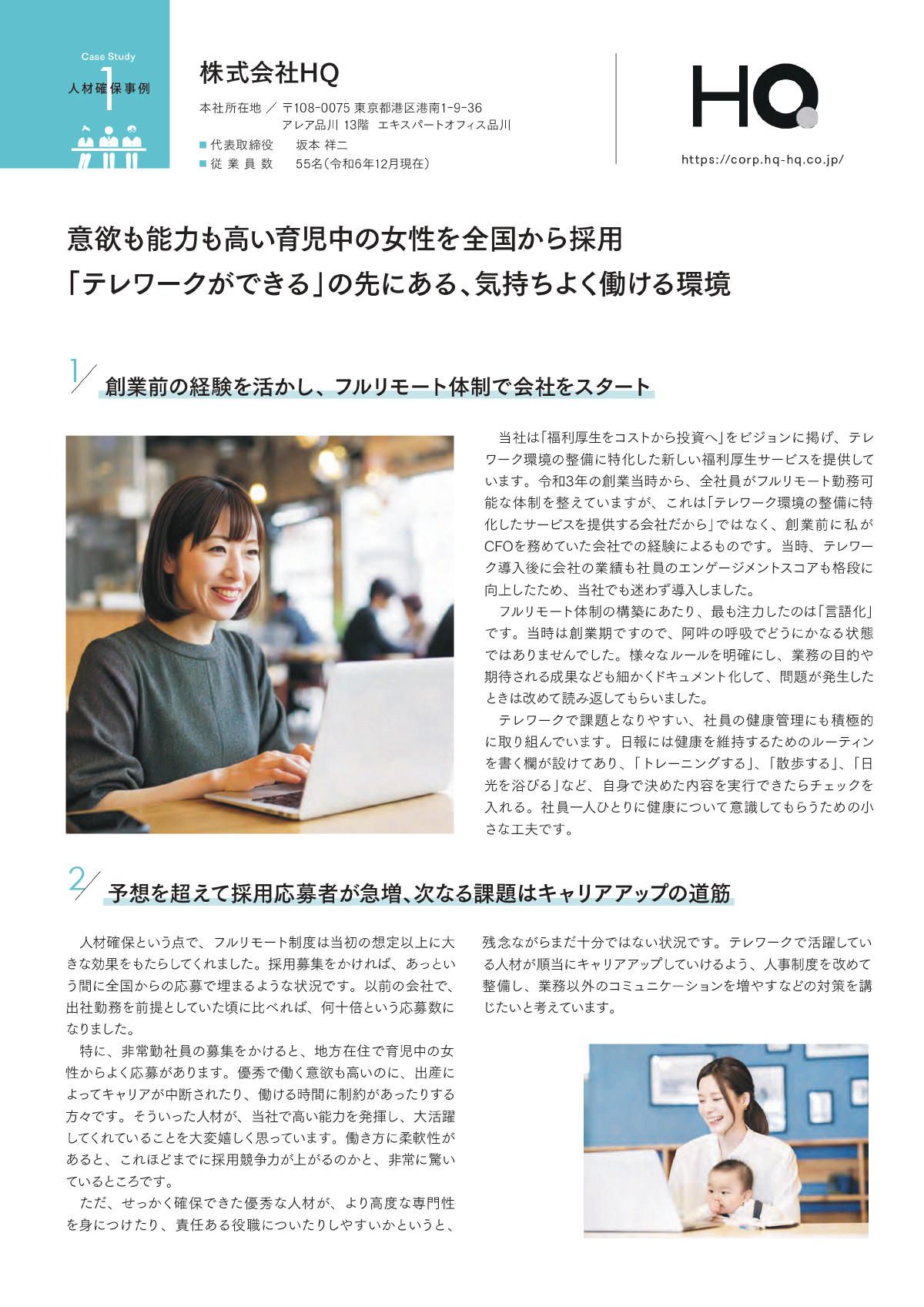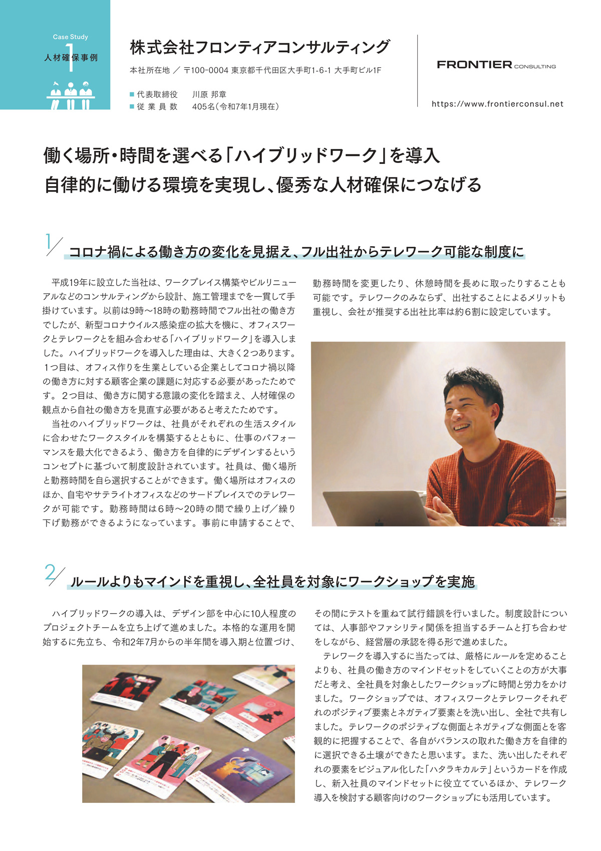 人材確保 事例集 新たな人材の採用や、既存従業員の離職防止など、テレワークによる人材確保の効果を得られた企業の事例をご紹介。 株式会社キャリア・マム 第一合成株式会社 株式会社HQ 株式会社フロンティアコンサルティング ⤢ 01/10 ✕ 01/10 PDFをダウンロード (1.38MB)