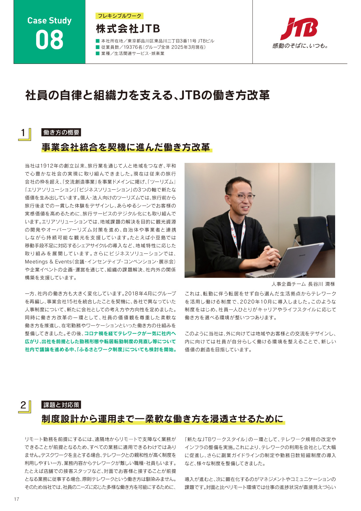 株式会社JTB テレワークやふるさとワーク制度を軸に、多様な働き方を支える仕組み。運用ルールとコミュニケーション基盤を整え、社員の自律と成果を両立させる環境。 ⤢ ✕ PDFをダウンロード(409KB)