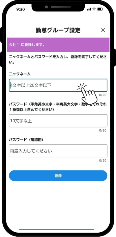 ❸QRコードを読み取ると、勤怠グループ設定画面に切り替わります。ニックネーム及びパスワードを入力し、登録ボタンをタップします。