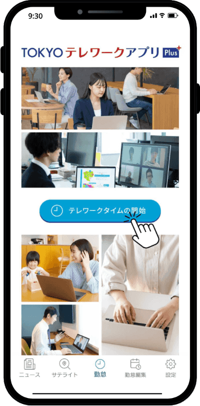 ❶アプリのホームにある、「テレワークタイムの開始」ボタンを押すと登録が開始します。